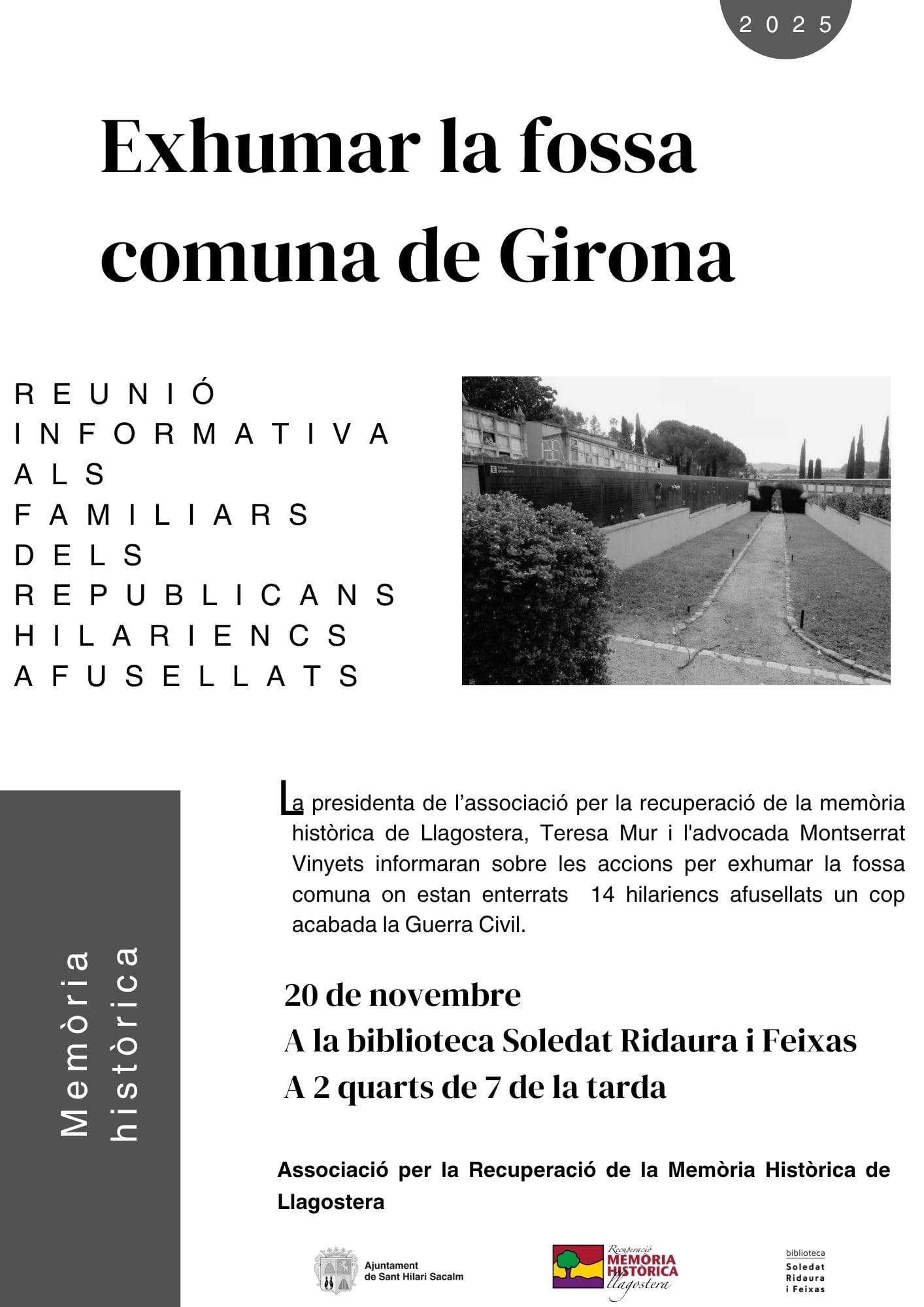 L’Associació per la recuperació de la memòria històrica de Llagostera informarà sobre la demanada que ha presentat contra la Generalitat per poder exhumar la fossa comuna del cementiri de Girona on hi ha enterrats alguns hilariencs